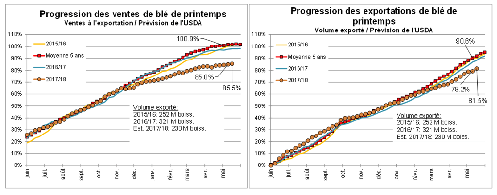 Les ventes de blé se situaient sur la limite supérieure des attentes à 112,00 tonnes pour l’ancienne récolte et 340,000 tonnes pour la nouvelle récolte. Cela portait le niveau de vente pour l’ancienne récolte à 871 million de boisseaux, soit une baisse de 17% par rapport à l’an dernier. De plus, il devient de plus en plus probable que l’objectif de 910 millions de boisseaux fixé par l’USDA ne sera pas réalisé et que celui-ci sera revu à la baisse de 10-20 millions de boisseaux. Pour les ventes de blé de printemps (blé de Minneapolis), le retard est encore plus important et il serait surprenant que celui-ci soit rattrapé. On s’attend à voir l’USDA diminuer ses prévisions une nouvelle fois en raison de l’important retard.