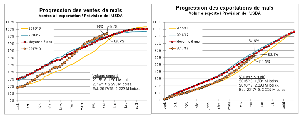 Cette semaine, les ventes américaines à l’exportation de maïs continuaient d’être fortes à 854,300 tonnes sur l’ancienne récolte, soit le double de l’an dernier à pareille date. À 95% de volume vendu, le marché est en avance de 2-3 semaines sur la moyenne quinquennale (90%). Le volume exporté a maintenant pratiquement rattrapé les moyennes historiques, après avoir trainé de la patte jusqu’au mois d’avril. Cela enlève de l’incertitude quant à l’annulation potentielle de commande. Pour la nouvelle récolte, les ventes ont totalisé 273,400 tonnes ce qui était supérieur aux attentes.