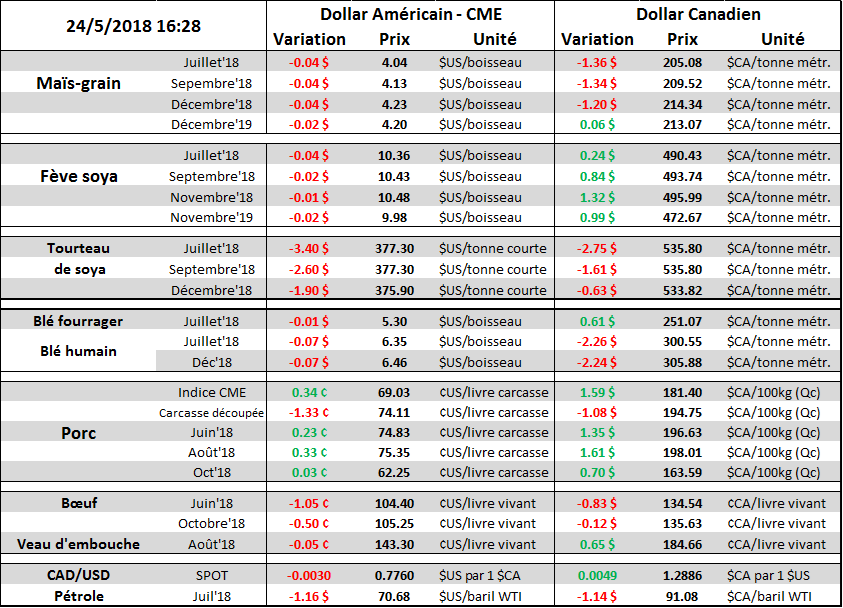 Pour le soya, il s’agissait de la 2e semaine d’annulation nette de ventes à l’exportation pour cette récolte, la dernière était à la mi-février. Malgré les annulations de la Chine (53,000 tonnes) et le déclin des achats, l’objectif d’exportation de l’USDA reste bel et bien envisageable. Contrairement à l’an dernier, le rythme de vente par semaine est inférieur à 4 millions de boisseaux d’ici la fin août versus des besoins de 6.5 million/semaine en 2017 pour atteint l’objectif de l’USDA. L’attention se porte désormais sur les livraisons, car celles-ci accusent encore un retard ce qui pose un risque d’annulation pour les prochaines semaines.