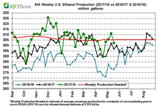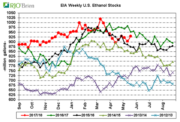 La semaine dernière, la production américaine d’éthanol était en baisse de 3.0% par rapport à la semaine précédente, mais demeurait 1.8% plus élevée que l’an dernier. Le rythme de production actuel est en ligne pour rencontrer les estimés d’utilisation annuelle de l’USDA, à 5.575 milliards de boisseaux de maïs. Malgré une hausse plus importante qu’attendue des inventaires, ceux-ci continuent d’être 2.3% plus bas qu’à la même date l’an dernier, à 22.13 millions de barils. Historiquement, avec l’arrivée des mois d’été occasionnant une augmentation de l’utilisation des automobiles, les inventaires prennent normalement une tendance baissière jusqu’au mois d’août. Un retour à une baisse des inventaires au cours des prochaines semaines ne serait donc pas surprenant.