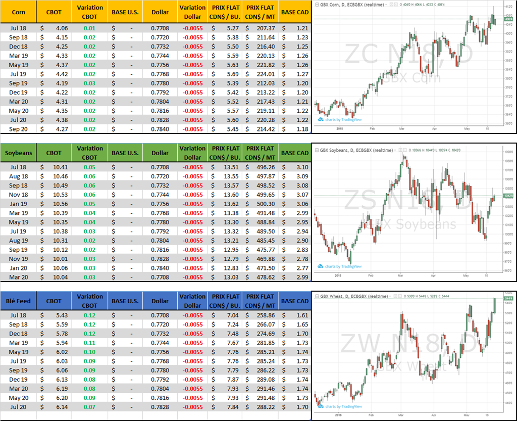 Les cours en fini en hausse cette semaine, majoritaire au niveau du blé et des fèves, le corn a suivi la valse en fermant à 4.25 $bu à la récolte. La poussée de prix des CàT de blé américain cette semaine est entraîné par les préoccupations en cours de la sécheresse dans les Prairies canadiennes, en Australie et Russie. Les projections privées de production de blé russe ont passé de 74-80 mmt plus tôt cette année (USDA à 72 mmt) et maintenant on parle des bas 70 et possiblement peut-être un peu moins. Ajoutez à cela le souci de la récolte de blé australien à venir qui sera plus proche de 20 mmt au lieu de USDA 24 mmt et vous avez stocks mondiaux de blé à en baisse autour de 258 mmt contre 270 mmt l'année dernière. Pour l’instant ce n’est que de prévisions, mais c’est ce qui circule entre analystes.