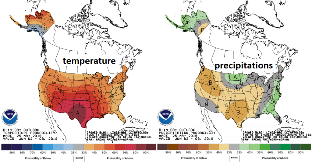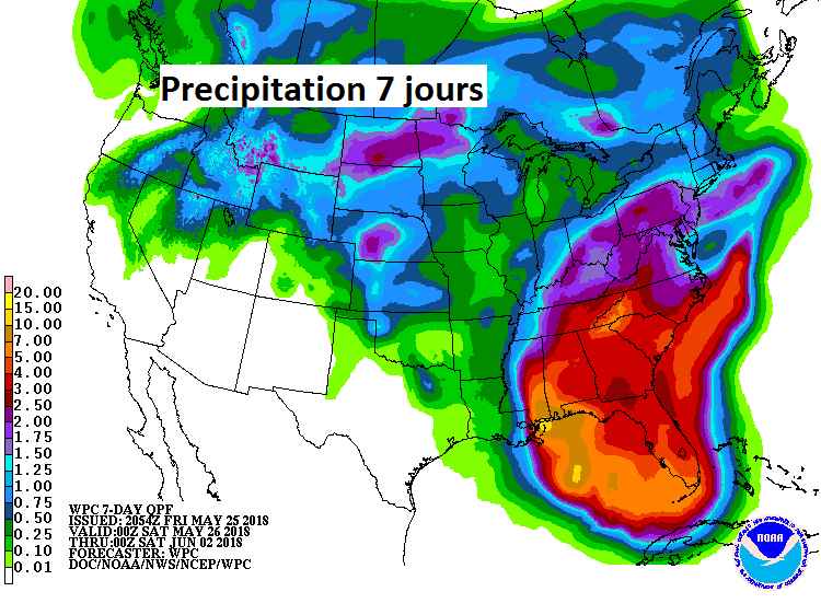 Tempête tropical (Alberto). La première de l’année… Alberto comme A comme l’alphabète. Après c’est quoi? Béatrice (je ne sais pas) mais ça sera un nom féminin qui commence à un B. Merci pour cette tranche de vie Simon. Ensuite pour le début juin on annonce assez chaud – on parle de 100+ degré principalement dans le sud au Texas et Oklahoma. Sera chaud pour le pauvre blé d’hiver.