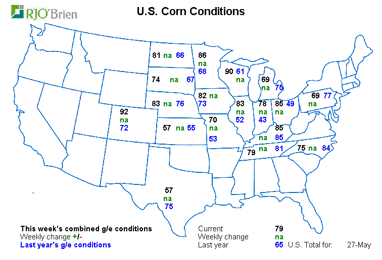 - Maïs américain : 79% good/excellent vs 65% l’an dernier à pareille date. SOLIDE DÉPART!