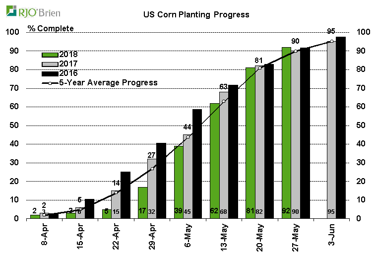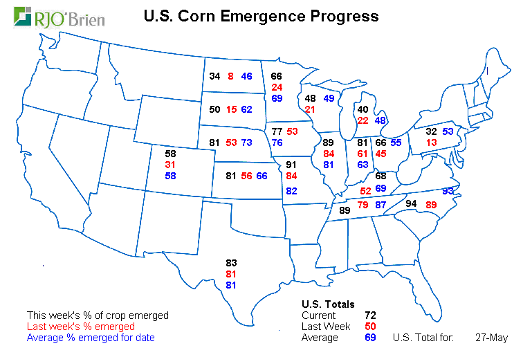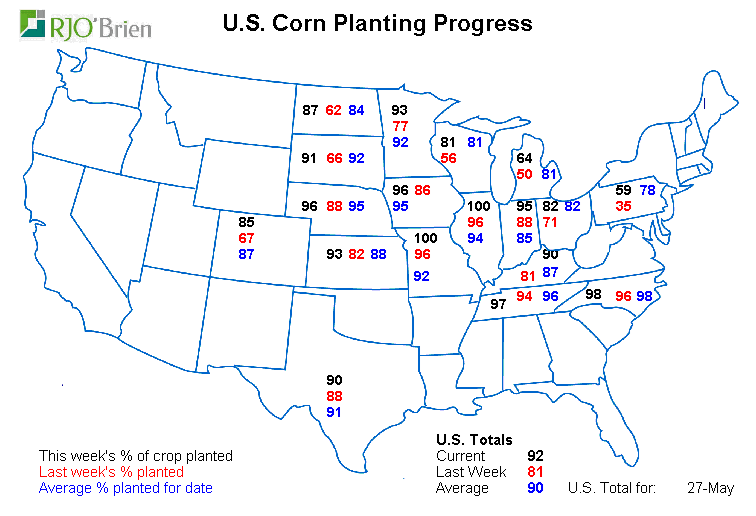 - Maïs américain : 92% de planté ; 90% l’an dernier; 90% en moyenne