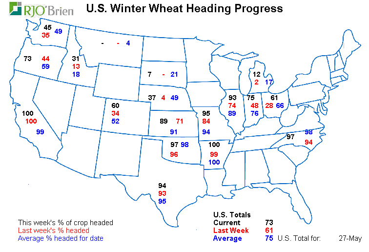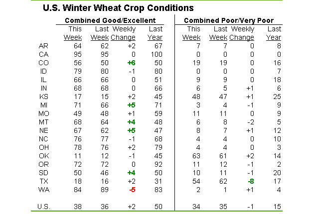 - Blé d’hiver américain : 38% bon/excellent +2% vs la semaine dernière; 50% l’an dernier