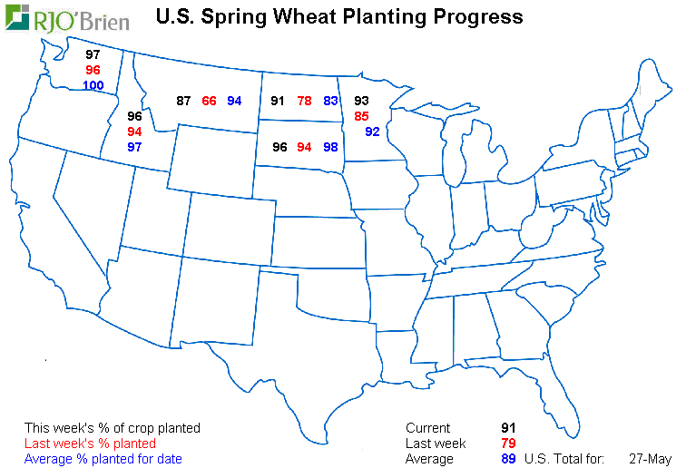 - Blé de printemps : 91% de planté; 95% l’an dernier; 89% en moyenne