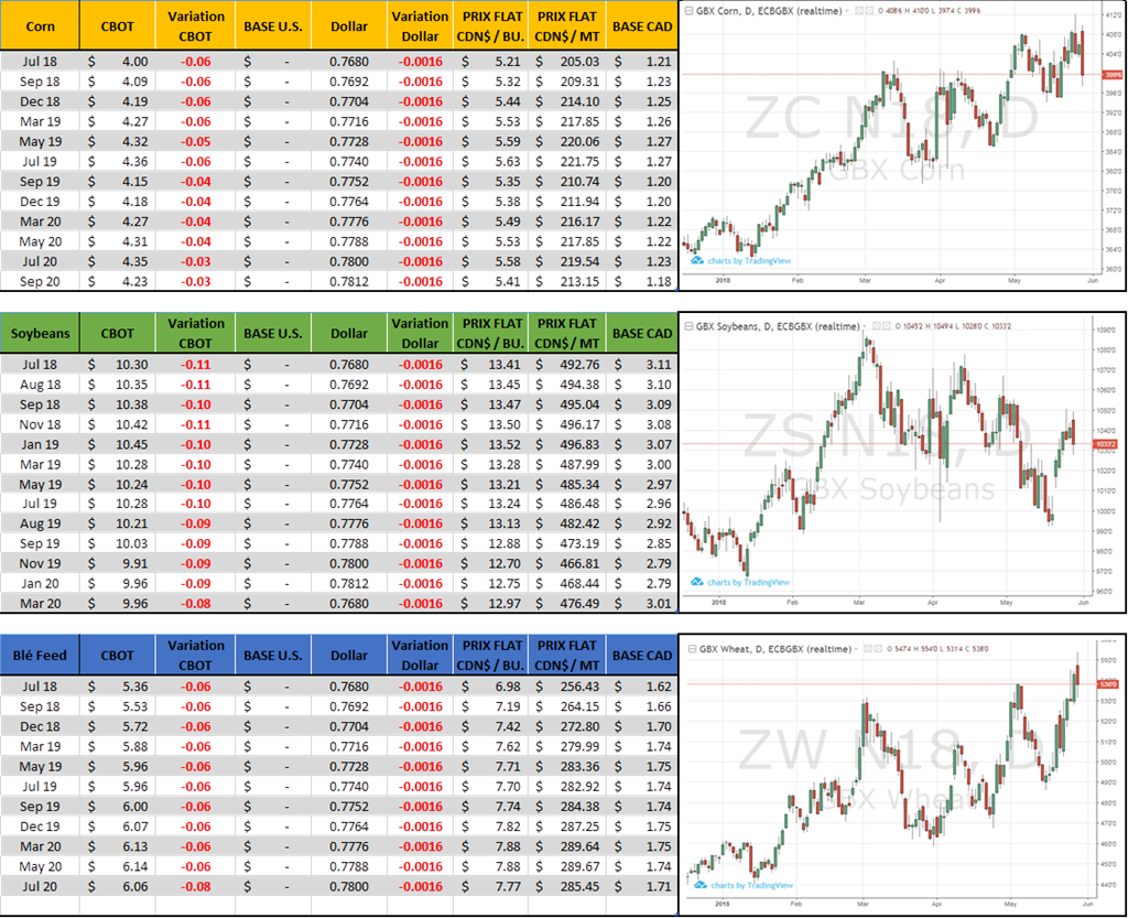 Déjà que ce n’est pas évident tenter de prévoir la direction des prix des grains avec la météo, les fonds de spéculation, les bilans offres demande de l’USDA, je trouve qu’on ajoute un cran de plus en mettant la politique dans le même bain. C’est assez dure à suivre, disons. La situation change à chaque jour, l’optimisme du lundi est rabroué le lendemain par des commentaires sur les médias traditionnel ou sociaux. Donc aujourd’hui dans la saga des tarifs douaniers avec la Chine, la Maison Blanche a publié une déclaration disant que l'Administration poursuivra son plan de mise de mise en œuvre des tarifs douaniers sur les produits chinois et limitera les investissements chinois. La liste finale des tarifs sera publiée le 15 juin. Cette annonce va à l'encontre du commentaire du secrétaire au Trésor, Mnuchin, selon lequel la guerre commerciale est « sur pause » et arrive à un moment où plusieurs responsables américains se préparent à aller à Pékin pour une autre série de pourparlers. Après les premières annonces de ces tarifs et la réaction de représailles de la Chine en avril, les acheteurs chinois ont boudé le soja américain, les prix ont chuté et les chinois n’ont réintégré le marché US seulement la semaine dernière.