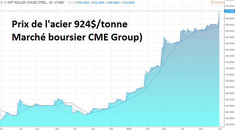 Un chapitre de plus aujourd’hui avec la mise en place des tarifs douanier sur l’acier et l’aluminium et pas de passe-droit pour le Canada, Mexique et l’Europe. Depuis novembre, le prix de l’acier a bondi de près de 60%, c’est une hausse spectaculaire qui aura un impact direct sur l’inflation aux USA. Beaucoup de produits de consommation couteront plus cher, de la canne de soupe Campbell à la canette de bière les prix à la consommation risquent d’augmenter.