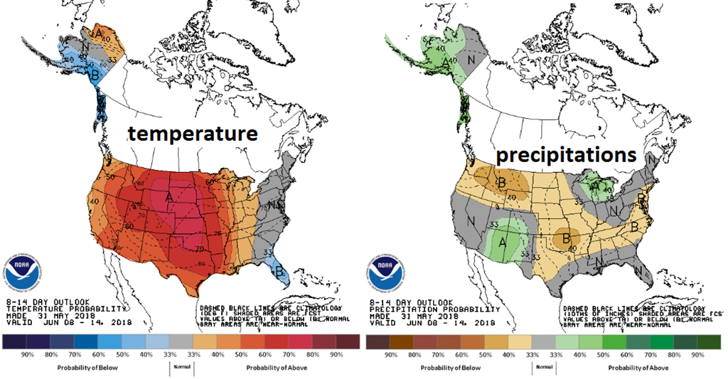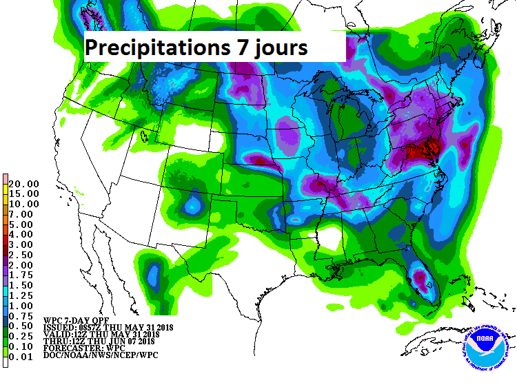 Cartes Météo : semble avoir de l’eau sur l’ensemble du Midwest mais ensuite les forecast pointe vers un peu plus chaud/sec à la mi-juin.