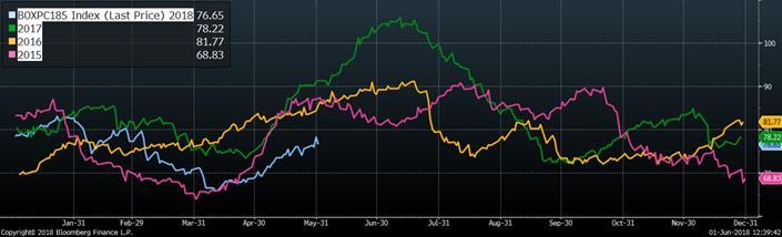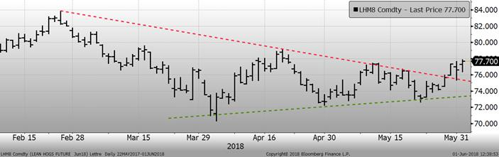 La séance d’hier a été particulièrement difficile pour les mois de juillet (-2.07¢/lb) et d’août (-1.67¢/lb), alors que le CàT de juin ne perdait que 0.70¢/lb. C’est la peur que le Mexique réplique aux États-Unis en imposant des tarifs sur le porc qui semble avoir alimenté le mouvement baissier d’hier. Cependant, quand on regarde le prix rebond du prix cash d’hier à +0.70 ¢/lb après 5 jours de surplace, et le gain de 10% de la valeur du jambon, on suppose que les acheteurs mexicains précipitaient des achats. Plus précisément, le prix cash a progressé à un rythme qui décevait le marché cette semaine, ne gagnant que 0.12¢/lb par jour en moyenne lors des 5 dernières publications. Le prix des découpes était publié en hausse à +2.17¢/lb en après-midi, à 78.22¢/lb, mais cela demeure bien inférieur aux moyennes historiques qui tournent d’avantage autour de 91¢/lb à pareille date.