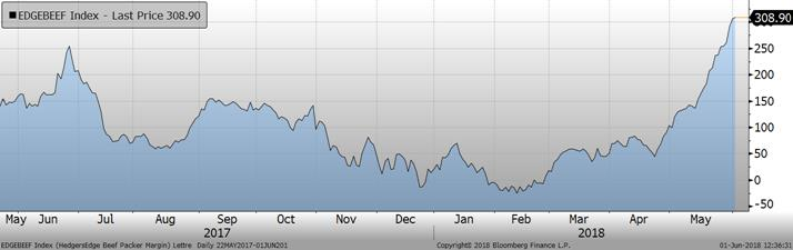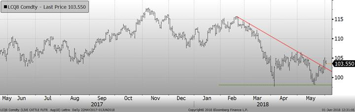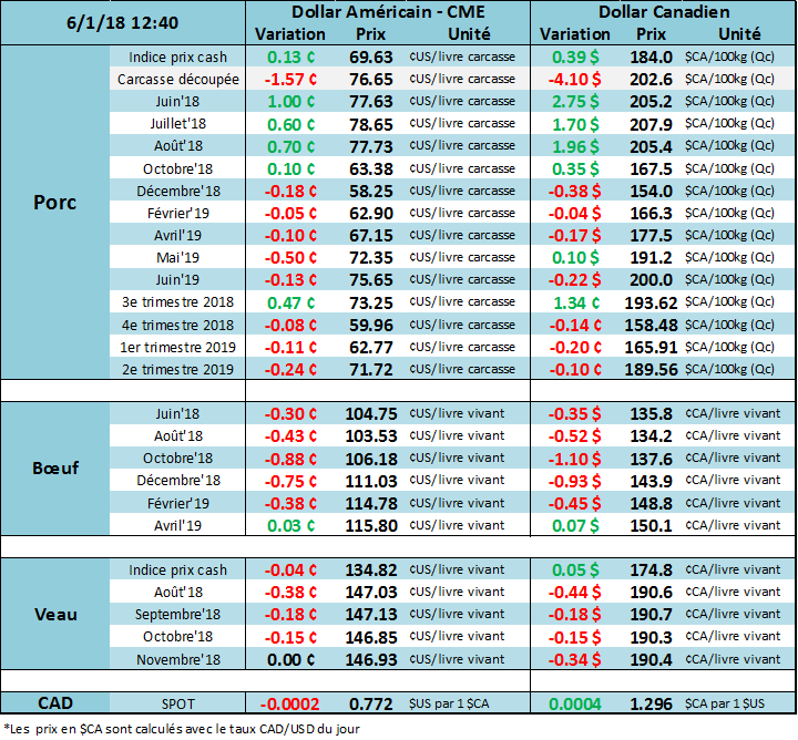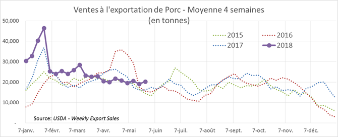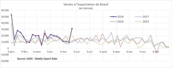 Les ventes à l’exportation américaines publiées hier par l’USDA pour la semaine du 24 mai étaient à un niveau record, à 31 271tonnes, comparativement à 12 078 tonnes pour la moyenne des 4 dernières semaines précédentes. Malgré toutes les nouvelles de tensions commerciales entre les États-Unis et ses partenaires, le bœuf semble avoir été épargné par les tarifs punitifs annoncés par la Chine, le Canada et le Mexique.