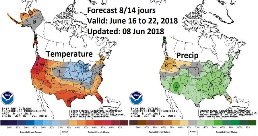 Coté Météo, encore une fois tout va bien. À court terme il y a chaleur et précipitations. La météo en juillet va être importante, certes, mais au moins à date il ne manque pas d’eau dans le cornbelt. Le forecast long terme est très beau aussi; pas de chaleur accablante et max très bonne probabilités de pluie. Rain makes corn (♪♪♪♪corn makes whiskey, whiskey makes my baby, feel a little frisky, Luke Bryan ♪♪♪♪)