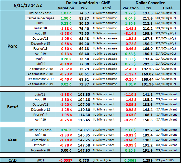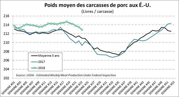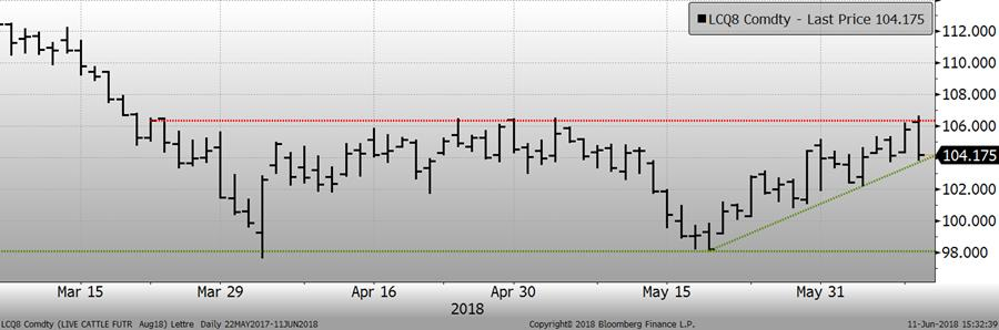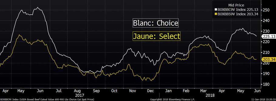 C’est l’attente d’une très forte progression de l’offre au 2e trimestre qui continuait de maintenir une pression sur le prix des contrats à terme d’été jusqu’à tout récemment. Il semble que cette augmentation ne s’est pas reflétée dans les statistiques d’abattages, ce qui a enlevé de la pression sur les prix la semaine dernière. L’USDA estimait que les abattages étaient de 658 000 têtes la semaine dernière, une hausse de seulement 3.5% par rapport à 2017. Cette hausse de la production de bœuf américain était la même (+3.5%) il y a deux semaines, ce qui est largement moins qu’initialement annoncé par L’USDA. Depuis le début de l’année, la production de bœuf gras est seulement 3.7% de plus que l’an dernier.