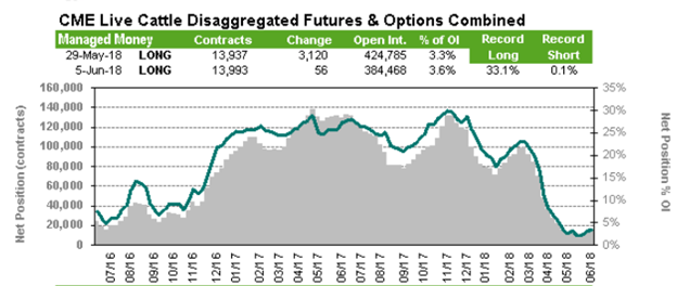 Le rapport des positions publié vendredi par le CFTC montrait que les spéculateurs étaient acheteurs net de 13 993 contrats, pratiquement inchangé sur la semaine. Les éleveurs, parcs et abattoirs étaient vendeurs net de 104 103 contrats, une baisse (achat) de 6323 contrats sur la semaine. Le nombre de contrats ouverts diminuait également de 40,317 contrats ouverts.