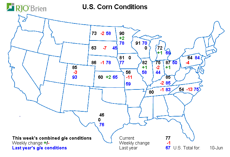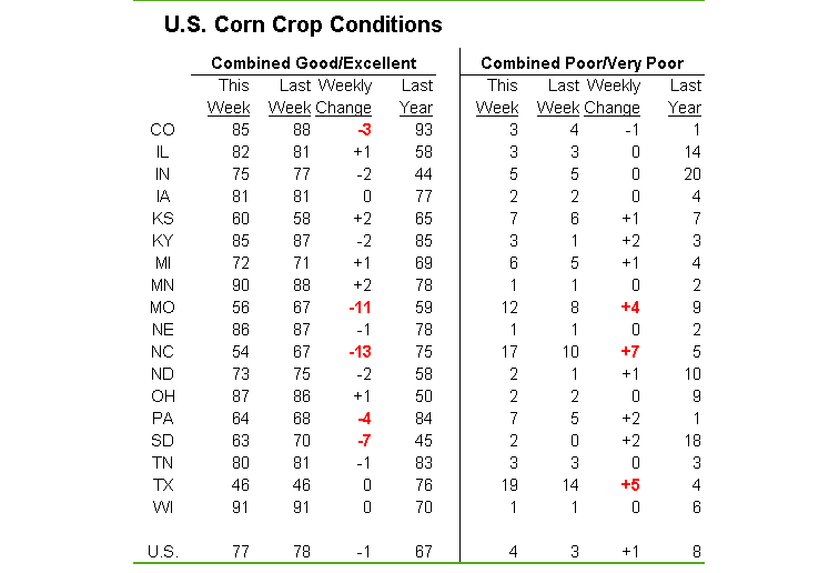 - Maïs américain : Baisse de -1% à 77% bon/excellent vs 67% l’an dernier à pareille date.