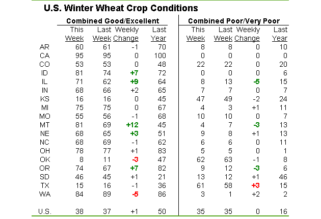 - Blé d’hiver américain : Hausse de +1% à 38% bon/excellent vs 50% l’an dernier à pareille date.