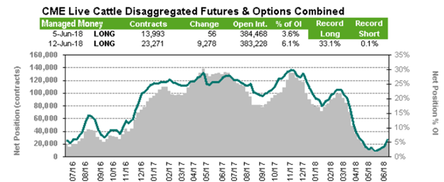 Le rapport des positions publié vendredi par le CFTC montrait que les spéculateurs étaient acheteurs net de 23 271 contrats, une augmentation (achat) de 9 278 contrats sur la semaine. Les éleveurs, parcs et abattoirs étaient vendeurs net de 105 486 contrats, une hausse (vente) de 1 683 sur la semaine.
