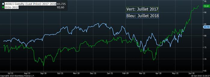 Pour l’instant, le prix du porc sur juillet continue sa tendance haussière et termine la séance d’aujourd’hui avec un gain de +2¢/lb ce qui permet au prix d’atteindre le plus haut sommet depuis la fin février à 83.82¢. Les prochaines résistances sont assez proches, à 84.00 ¢ et ensuite, ce sont les hauts de l’hiver dernier à 85.50 ¢/lb. Fort possiblement que le contrat de juillet peut continuer à s’apprécier, tout cela dépendra du moment où le prix cashralentira. Pour l’instant, ce n’est pas le cas avec un gain de +1.23¢ pour la journée de vendredi, avec un prix cash à 83.48¢ (indice CME à 82.86 demain matin, +1.42). L’an dernier, le cash avait plafonné à 92¢ à la mi-juillet ce qui a permis au contrat de juillet 2017 d’expirer à 92.60¢… le prix du CàT de juillet 2018 semble avoir la même trajectoire depuis quelques jours, on est au même prix que juillet 2017 à cette période de l’année… reste à voir jusqu’où ça ira!