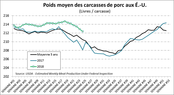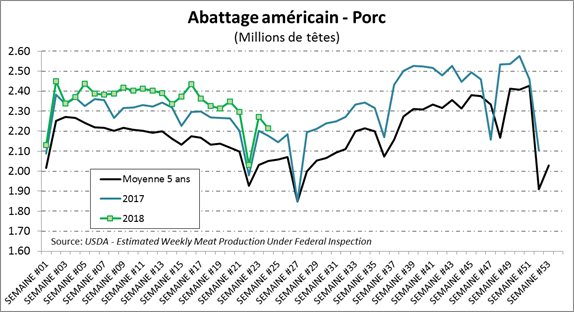 Vendredi dernier, l’USDA estimait que les abattages hebdomadaires étaient de 2.215 millions de têtes, en hausse de +1.7% par rapport à l’an dernier. Il s’agit également d’une baisse de 56 000 têtes comparativement à la semaine précédente. Le poids des carcasses, à 212.4 livres, continue de demeurer 2% au-dessus de la moyenne saisonnière des 5 dernières années. Une bonne nouvelle est que le poids par bêtes continue à diminuer et que les abattages ont ralentis. Mises ensemble, la production de la semaine dernière était en hausse de +3.8% comparativement à 2017, mais en baisse de -2.7% par rapport à la semaine précédente.