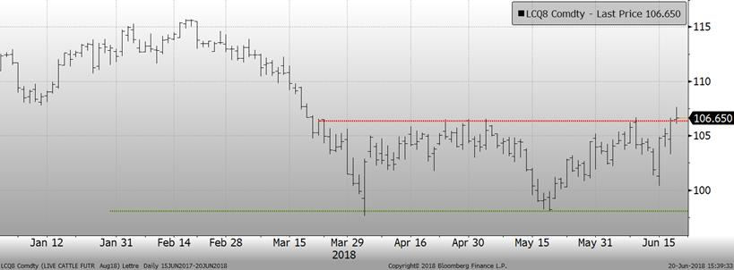 Aujourd’hui, le bœuf d’août terminait à son plus haut niveau depuis le 20 mars, à 106.65¢/lb. Il semble que le marché avait réagi de façon trop négative aux annonces de la Chine dans la saga des tensions commerciales. Les fondamentaux n’étaient pas si négatifs, car les exportations de bœuf vers la Chine sont réellement minimes et le bœuf d’août s’échange encore à escompte comparativement au prix cash qui se transigeait autour de 112¢/lb vendredi dernier.