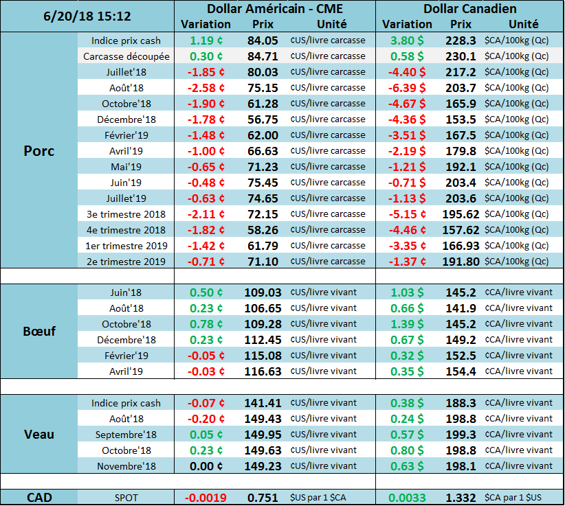 Concernant le rapport Cattle-on-Feed de vendredi, les analystes s’attendent à une baisse de -4.4% des placements en mai versus 2017. Pour ce qui est de la mise en marché, on s’attend à une hausse de +5.1% (vs 2017). Les troupeaux en parc d’engraissement seraient à la hausse de +3.4% par rapport à l’an dernier. Les analystes citent une amélioration des conditions des pâturages dans des plaines centrales et le mid-ouest américain comme un élément favorable au prix. Ces bonnes conditions ont ralenti les abattages pour les bêtes en pâturage et diminué les placements en parc.