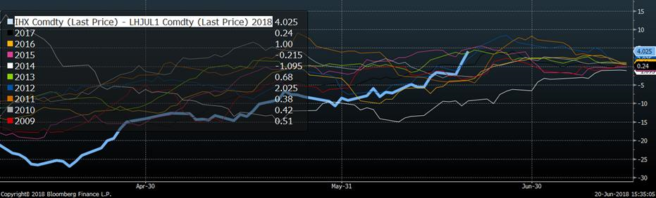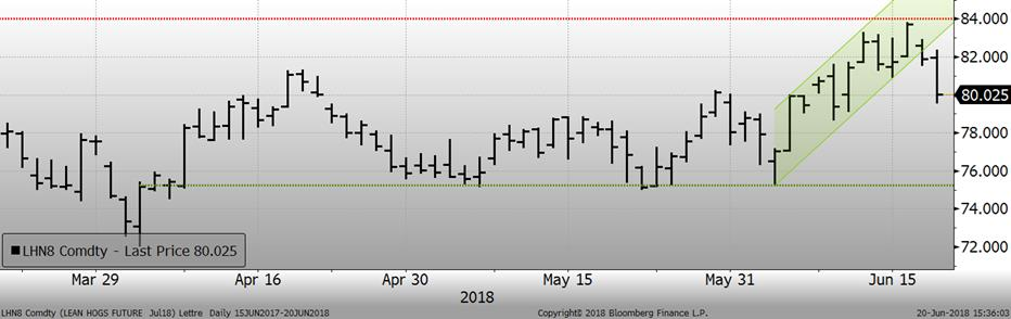 La récente remontée du prix cash a aidé à supporter les contrats à terme jusqu’à la fermeture de lundi, mais l’avenir s’annonce plus difficile si les relations commerciales américaines avec le Mexique, le Canada et la Chine (bref, le monde entier!) continuent de s’envenimer. À eux seuls, le Mexique et la Chine totalisent la moitié des exportations de porcs américains, d’où la sensibilité du marché lorsqu’une mauvaise nouvelle politique sort. Hier l’ensemble des échéances perdaient des plumes suite aux répliques de Trump envers la Chine, en plus des anticipations que la demande atteindra son sommet saisonnier dans les prochains jours après que les commandes pour le 4 juillet soient complétées. La panique s’est poursuivi aujourd’hui avec une baisse d’environ 2¢ sur juillet et même que l’échéance d’août a atteint la limite journalière du -3¢/lb par moment. La chute s’est accélérée après la publication du prix cash d’hier qui montait de seulement +0.80 ¢/lb, c’est la plus petite augmentation en deux semaines. L’indice CME du prix cash sera publié demain à 85.14¢/lb ce qui représente une prime de 5¢ au-dessus du CàT de juillet qui est à 80¢. À cette période de l’année, le CàT de juillet est historiquement 1¢ de plus que le cash… il va s’en dire que la structure à terme des prix démontre des anticipations négatives face à la progression du prix pour les 3 prochaines semaines. Si le cash démontre encore des signes de force demain matin, il ne serait pas surprenant de voir un rebond sur le contrat de juillet.