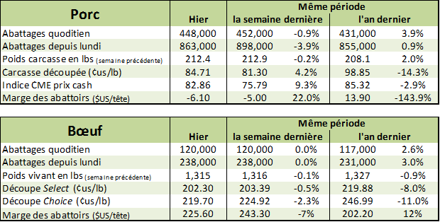 Les abattages étaient estimés à 120 000 têtes hier, inchangées par rapport à mardi la semaine dernière. Cela porte le total pour le début de la semaine à 238 000 têtes sans changement par rapport à la semaine dernière, mais en hausse de +1.3% comparativement à la même période l’an dernier.