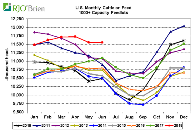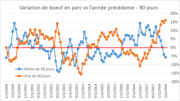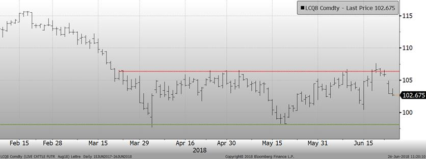 Vendredi, le rapport Cattle on Feed publiait un estimé de l’état actuel des parcs d’engraissement. Les placements et les inventaires se sont avérés supérieurs aux estimés des analystes ce qui a négativement affecté le marché hier. Premièrement, après deux mois de diminution par rapport à 2017, on s’attendait à une baisse des placements, mais ceux-ci se sont avérés être de retour en territoire positif, bien qu’il s’agisse du hausse très modeste (+0.2%). Les placements se sont avérés plus hauts que prévu pour les poids légers, ce qui aura pour effet d’augmenter l’offre à moyen terme. Deuxièmement, même si les mises en marché étaient au rendez-vous, en hausse de +5.4% versus 2017, les inventaires n’ont pas diminués pour autant. Des 11.55 millions de têtes en parc au 1er juin, on note que la majorité est en engraissement depuis plus de 3 mois. Comparativement à l’an dernier, il y a +16.1% plus de bœufs qui sont engraissement depuis plus de 90 jours alors qu’il y a -5.7% moins de bœuf en parc depuis moins de 90 jours. Il semble que le marché anticipe encore une abondance de l’offre à court terme au niveau élevé des inventaires de bœufs en engraissement depuis plus de 3 mois.