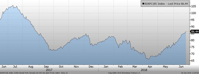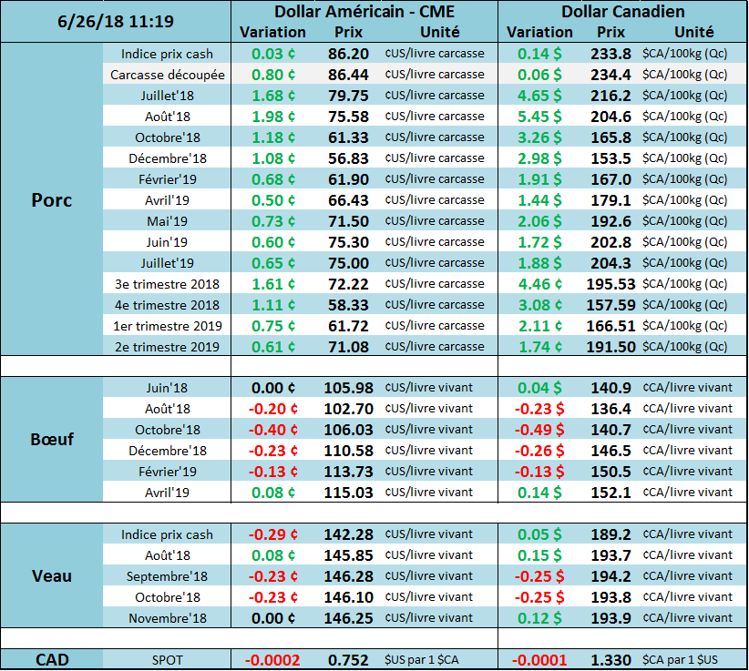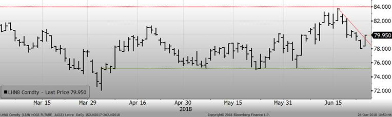 Hier le prix du porc de juillet clôturait à la baisse de -1.75¢/lb pour terminer à 78.08¢/lb sur juillet. L’ensemble des échéances terminait également à la baisse (août : -1.77¢/lb, octobre : -1.15¢/lb, décembre : -0.82¢/lb). Les deux éléments qui inquiètent le marché sont le changement de tendance du prix cash et les craintes quant à l’avenir du marché d’exportation américain. À eux seuls, la Chine et le Mexique totalisent 50% des exportations de porc américain et à partir du 6 juillet, la taxe augmentera à 20% pour les importations de porcs américains au Mexique (présentement à 10%) alors que la Chine va également augmenter les taxes sur une gamme de produits agricoles américains. En Chine, le porc américain est déjà taxé depuis plusieurs mois, l’impact devrait être moindre qu’au Mexique, mais demeure tout de même négatif pour le prix puisque les espoirs d’une réconciliation Chine – US disparaît.