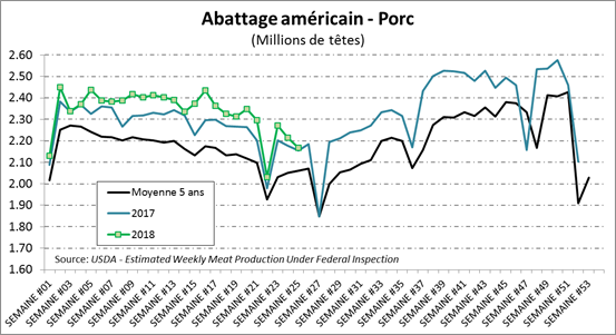 Vendredi dernier, l’USDA estimait que les abattages pour la semaine dernière étaient de 2.17 millions de têtes, en hausse de +0.6 % par rapport à l’an dernier. Il s’agit d’un élément positif pour le prix si le ralentissement des abattages observé dans les deux dernières semaines se maintient. Il s’agit également d’une baisse de 47 000 têtes comparativement à la semaine précédente. Le poids des carcasses, à 211.2 livres, demeure cependant +1.9% plus élevé que l’an dernier, contribuant à la hausse de l’offre. Mise ensemble, la production de la semaine dernière était en hausse de +2.5% comparativement à 2017.