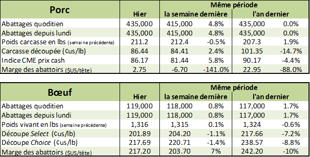 L’USDA estimait que les abattages étaient de 664 000 têtes la semaine dernière, une hausse de +10 000 têtes (+1.5%) comparativement à la semaine précédente et en hausse de +3.9% par rapport à 2017. Combinée à un poids par bête légèrement à la baisse, la production était à la hausse de +3.2% par rapport à l’année précédente.