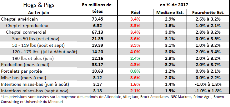 La grosse surprise est le nombre de mise-bas de mars à mai. Dans le rapport précédent, les intentions de mises-bas pour le printemps étaient à +2.3% ce qui était également près des intentions publiées dans le rapport de décembre. Cependant, il y a eu 3.12 millions de mises-bas ce printemps, représentant une croissance de 3.6%!! C’est assez surprenant de voir ce bond entre le rapport de juin et mars puisque ces truies étaient déjà inséminées lors du sondage de cet hiver... d’où la surprise! La fourchette des estimés étaient de 0.0% à +2.2% d’augmentation de mises-bas, les anticipations étaient basés sur les intentions des rapports précédents. Conséquemment, tous les chiffres du cheptel américain sont plus élevés qu’anticipés.