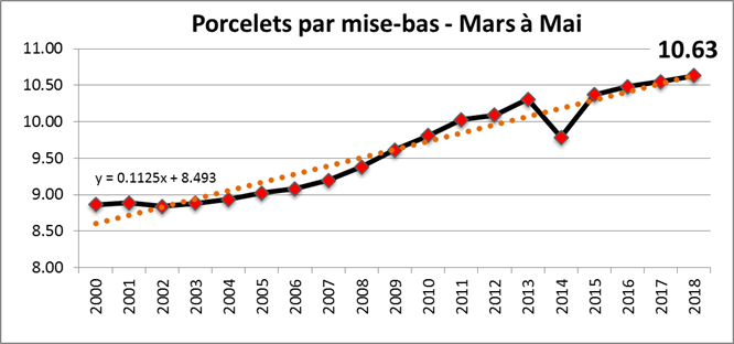 La productivité des maternités était légèrement en-dessous des attentes avec 10.63 porcelets après sevrage, soit 0.08 porcelet de plus que l’an dernier. Comme vous pouvez voir sur le dernier graphique, il y a des gains de productivité de 0.11 porcelet par année en moyenne depuis près de 20 ans, l’augmentation qu’on connait en 2018 est donc plus faible. En somme, la production de porcelets fût de 33.17 millions ce printemps, largement au-dessus des prévisions avec une croissance de 4.3% relativement à la production de 2017 (médiane des estimés à +3.6%).