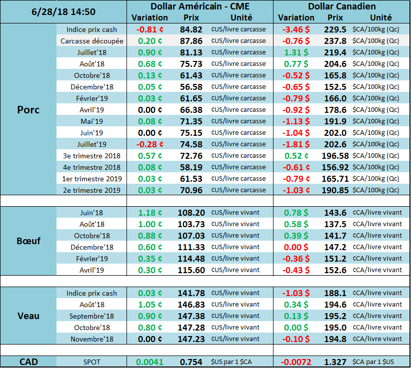En ce qui concerne le cheptel commercial, on parle d’un troupeau de 67.13 millions têtes comparativement à 64.9 millions l’an dernier, soit une augmentation de 3.4% versus des attentes de +3.0%. En ce qui a trait aux plus gros porcs (180 lbs et +), il n’y en a moindre que prévu ce qui se reflète dans les chiffres d’abattages des dernières semaines. À 12.16 millions de porcs de 180 lbs et plus, la production de juin devrait tourner à +2.4% de croissance (moyenne de +2.5% ces 3 dernières semaines)… c’est cohérent! Parlons de ce qui s’en vient maintenant… La production pour les 5 semaines à venir (juillet à début août) correspond au troupeau de 120 à 179 lbs qui est de 14.20 millions têtes, en hausse de +4.0% versus des attentes à +3.0%. Pour la classe de poids de 50 à 119 lbs (production d’août et septembre), il y a 19.39 millions de jeunes porcs ce qui représente une croissance de 3.5% (estimés à +3.1%). Pour les plus jeunes porcelets, à 50lbs et moins, il y en a 21.4 millions ce qui est 3.6% de plus que l’an dernier et est également au-dessus des attentes. Les 3 classes des poids de moins de 180 lbs sont au-dessus de la fourchette des prévisions ce qui démontre à quel point l’offre de porc à venir est largement plus qu’anticipée… cela devrait être négatif pour les prix.