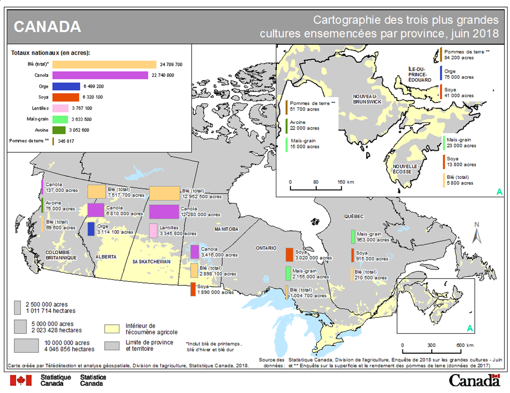 Au Québec, la superficie ensemencée en soya a diminué de 7,0 % par rapport à 2017 pour s'établir à 915 000 acres. Les agriculteurs de la Saskatchewan ont aussi déclaré un moins grand nombre d'acres ensemencés, soit 407 500, une baisse de 52,1 % par rapport à l'an dernier.
