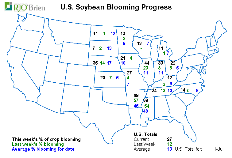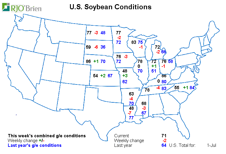 - Condition du soya américain : 71% bon/excellent vs 72% attendu (71-73% fourchette), 73% semaine dernière, 64% l’an dernier (+1% dans « excellent » / -3% dans « bon »)