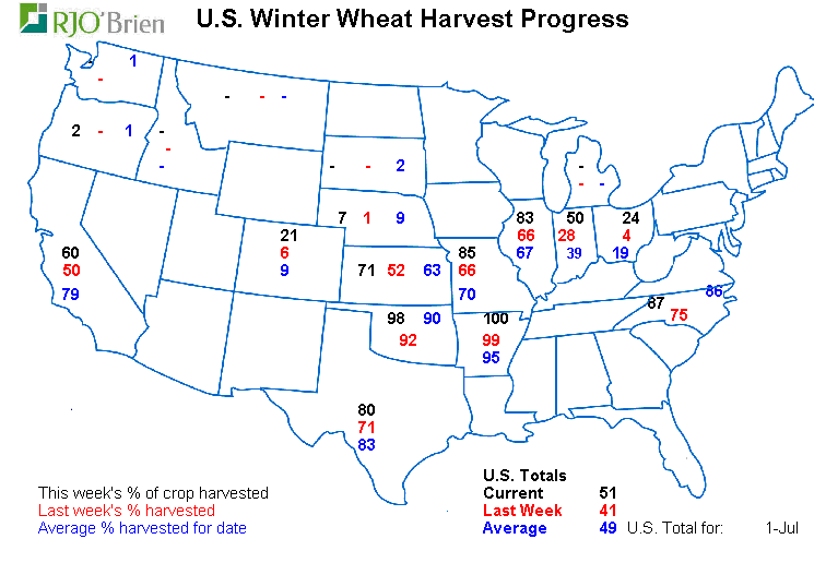 - Moisson du blé d’hiver : 51% récolté vs 56% attendu (53-60% fourchette), 41% semaine dernière, 51% l’an dernier, 49% moyenne