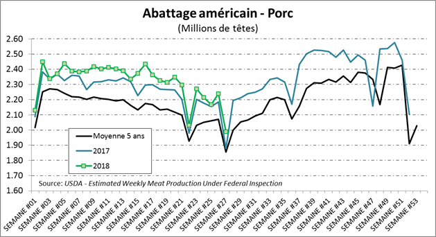 L’USDA estimait que les abattages étaient de 562 000 têtes la semaine dernière, une hausse de +2.7% par rapport à 2017. Avec un poids par bête légèrement en baisse, la production était en hausse de +1.5% par rapport à l’an dernier.