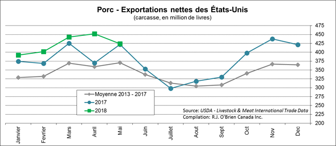 Aujourd’hui, l’USDA publiait les exportations nettes de porc à 424 millions de livres pour le mois de mai. Celles-ci se situaient au même niveau que l’an dernier alors que la production grimpait de 4.6% durant la même période, laissant l’augmentation de la production en sol américain. Les exportations ont atteint 515.8 millions de lbs, principalement vers le Mexique (161 M lbs), le Japon (106 M lbs) et la Corée du Sud (67 M lbs). En mai, les volumes achetés par la Chine et Hong-Kong étaient de seulement 35.7 M lbs, les plus faibles depuis septembre 2017. Il sera très intéressant de suivre la progression des exportations pour les mois de juin et juillet, à savoir si les acheteurs mexicains et chinois ont précipité des livraisons en juin avant l’arrivée des taxes.