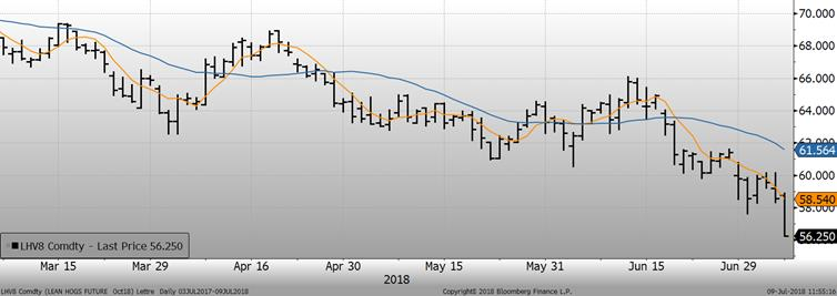 Vendredi, le porc juillet et d’août terminaient la semaine en baisse, à 81.38/lb et 75.43¢/lb respectivement. Pour juillet, cela représentait une baisse de -1.93¢/lb par rapport à la veille tandis qu’août perdait -0.63¢/lb. Vendredi, le prix des découpes s’établissait à 84.45¢/lb, en baisse de -2.33¢/lb par rapport à la semaine précédente. La dégringolade s’est poursuivie aujourd’hui après l’augmentation des taxes sur le porc américain. Les mois d’août à décembre perdent -2.3 ¢/lb en matinée et à ces niveaux, ce serait la plus faible fermeture pour les 3 derniers contrats de 2018. Techniquement, rien n’indique qu’on a touché le creux de la baisse ce qui laisse les acheteurs sur les lignes de côté, en attendant de voir un potentiel rebond.