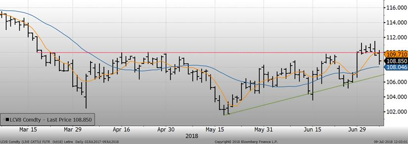 Techniquement, le prix du bœuf ne semble pas avoir été capable de maintenir la tendance haussière des dernières semaines. Aujourd’hui, on retombe en dessous de l’ancienne résistance et ce ne serait pas surprenant de voir le prix d’octobre retourner à son support, vers 107 ¢/lb.