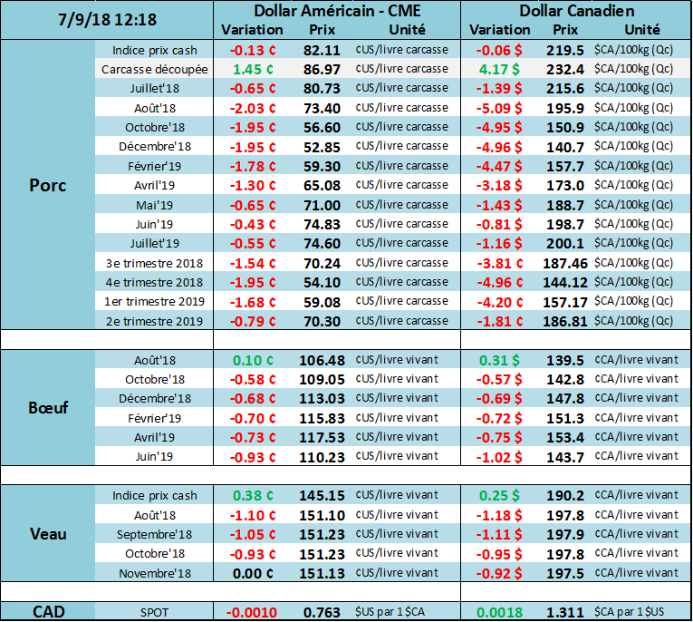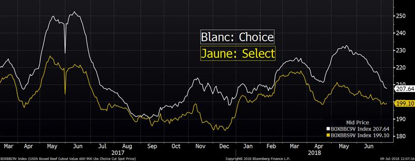 Vendredi dernier, l’USDA estimait que les abattages hebdomadaires étaient de 1.988 million de têtes, en hausse de +5.9% par rapport à l’an dernier. Il s’agit également d’une baisse de 251 000 têtes comparativement à la semaine précédente dû à la journée fériée du 4 juillet. Une bonne nouvelle est que le poids des carcasses a rapidement diminué au cours des dernières semaines. Les chaleurs intenses semblent avoir fait fondre le poids moyen par bête, à 209.3 livres ou +0.8% au-dessus des moyennes saisonnières. Il y a 3 semaines seulement, le poids par bête était +2% de la moyenne saisonnière des 5 dernières années. Mise ensemble, la production de la semaine dernière était en hausse de +6.7% comparativement à 2017. Si les éleveurs ont envoyé leurs bêtes plus rapidement que prévu à l’abattage à cause des prévisions de températures élevées qui n’aidaient pas à la prise de poids, cela pourrait diminuer légèrement les abattages au cours des prochaines semaines.