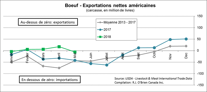 Dans le bœuf, les exportations nettes pour le mois de mai sont demeurées bien au-dessus de la moyenne des dernières années à -5 millions de livres. On voit que depuis le début de l’année, le marché du bœuf américain est seulement local puisque les exportations et importations s’équivalent.