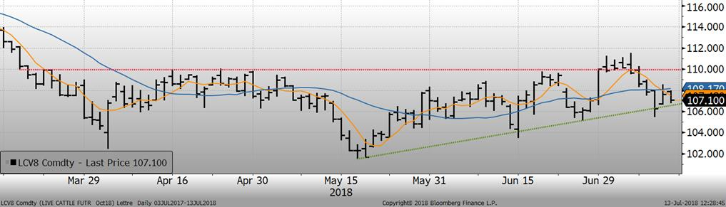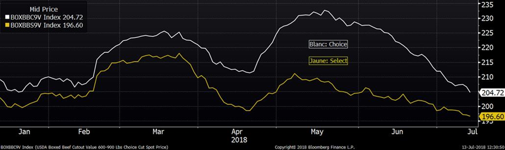 Dans le rapport Offre et Demande de l’USDA (WASDE), les prévisions de production pour cette année sont restées pratiquement inchangées. Hier, les contrats à terme d’août rebondissaient de +1.17¢/lb, à 105.03¢/lb. Le bœuf d’août continue de se transiger à 8-10¢/lb d’escompte sur le prix cash de la semaine dernière. Certains analystes disent que le marché puisse avoir été survendu mercredi lorsque le bœuf d’août se transigeait sous 103¢/lb.