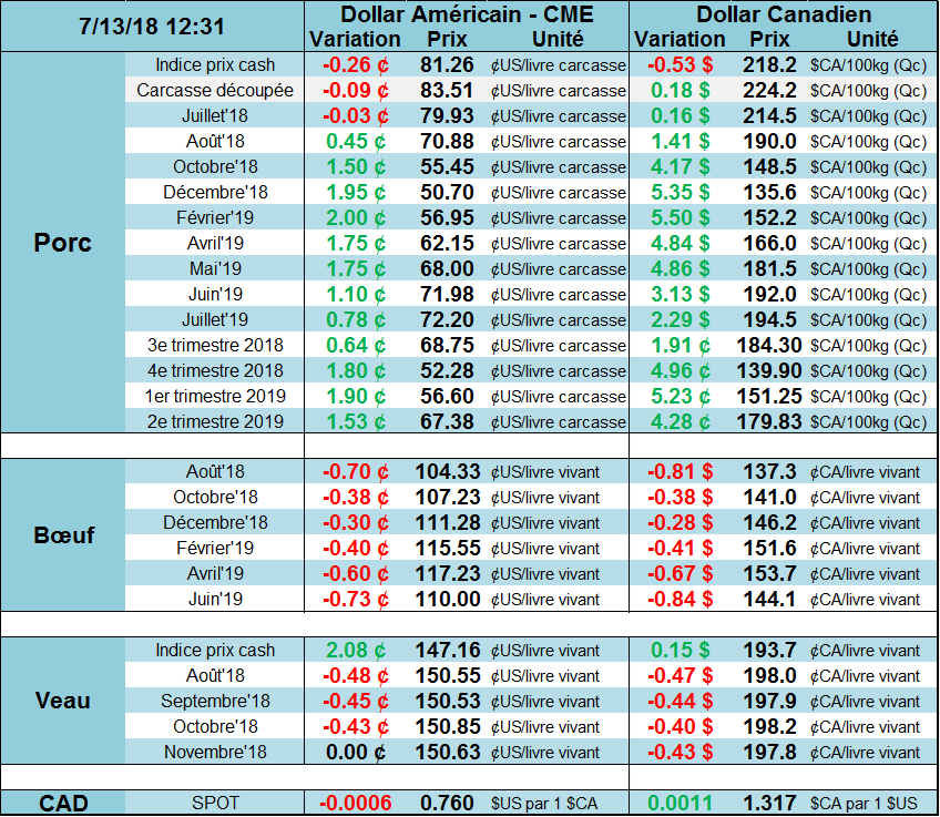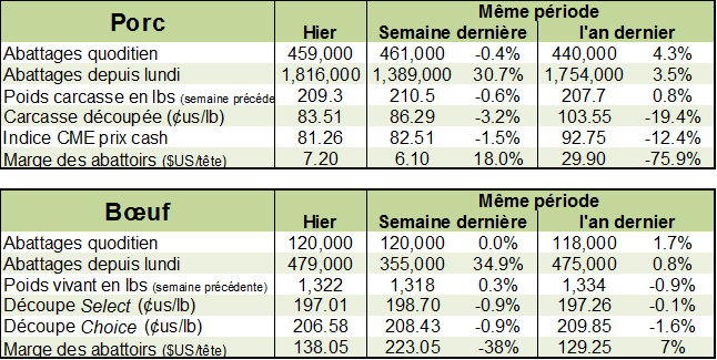 L’USDA estimait que les abattages étaient de 120 000 têtes hier, amenant le total de la semaine à 479 000 têtes. L’an dernier, les abattages étaient de 471 000 têtes pour la même période. Hier, les ventes à l’exportation américaines publiées pour la semaine du 5 juillet étaient en hausse, à 16 226 tonnes, comparativement à 12 936 tonnes pour la semaine précédente. La moyenne des 4 dernières semaines se situe à 16 074 tonnes, un niveau supérieur aux 4 dernières années.