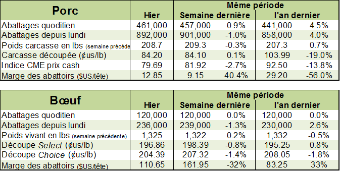 Les abattages étaient estimés à 120 000 têtes hier, inchangées par rapport à mardi la semaine dernière. Cela porte le total pour le début de la semaine à 236 000 têtes, en hausse de +4.4% ou 10 000 têtes comparativement à la même période l’an dernier.