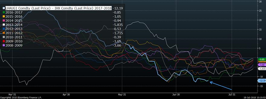 Écart entre le contrat d’août et le prix cash depuis 10 ans