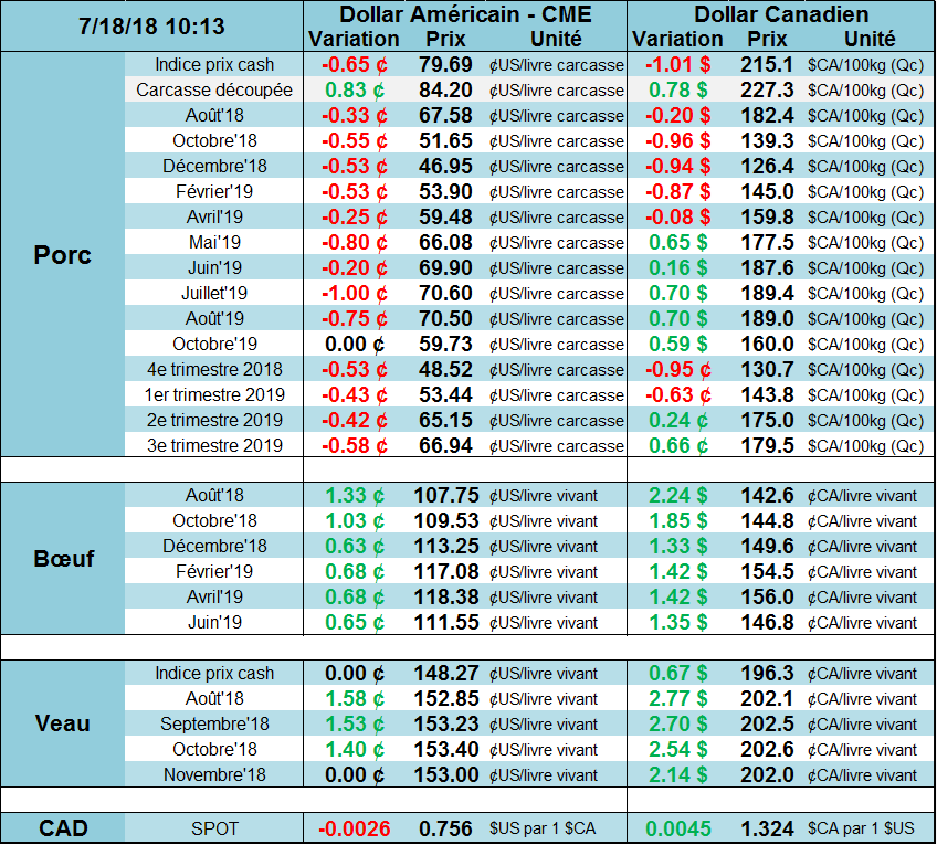 Le bœuf de décembre a rebondit depuis ses bas à 109.80¢ le 11 juillet. Hier, le CàT de décembre clôturait à 112.63¢/lb, mais le potentiel haussier semble limité si le flow de l’offre actuel se continue et si les tensions commerciales continuent d’avoir un impact négatif sur les exportations agricoles américaines. Hier, le bœuf d’août terminait en baisse de -0.50¢/lb, à 106.43¢/lb. Le prix des découpes était en hausse de +0.63¢/lb dans le Choice et gagnait +1.19¢/lb dans le Select. La découpe deChoice se situe maintenant à 204.39¢/lb, comparativement à 207.32¢/lb la semaine dernière.