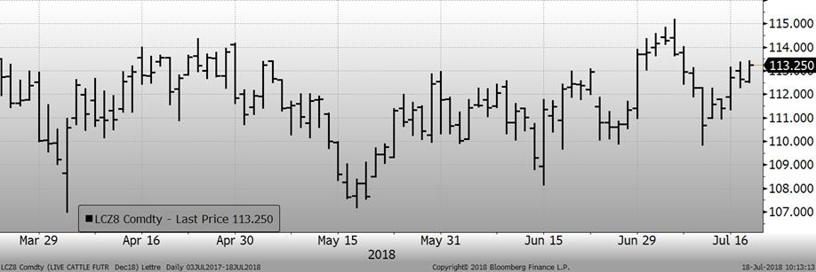 Vendredi deux gros rapports seront publiés par l’USDA : le cattle-on-feed (parc d’engraissement) et le rapport biannuel cattle inventory (cheptel bovin). Les analystes s’attendent à une hausse de +0.6% des placements versus l’an dernier et à une hausse de +1.1% des mises en marché. Mise ensemble, les analystes s’attendent à ce que le rapport annonce que les bœufs en parc aient augmenté de +4% en juillet par rapport à 2017.