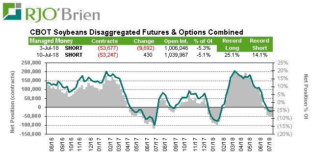 1. Les fonds ont passé d’un net long à un net court en seulement 4 semaines, autant dans le corn que dans le soja. Toujours possible d’ajouter un peu, mais aux niveaux de prix actuel l’augmentation des positions de vente risque d’être plus limité. Aussi, on pourrait commencer à voir des prises de profits ou même un renversement si jamais le fondamental/technique le suggère.